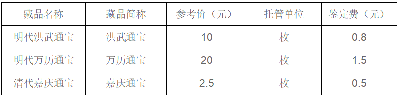 本次托管古代铜质币藏品要求为:钱体无裂纹、破损、漏眼、变形、害锈(浅绿色粉状锈),修补、严重腐蚀、大的铸缺和磨损等问题,字迹清晰可辨。明显小于正常规格的藏品,鉴定公司有权不予接收。