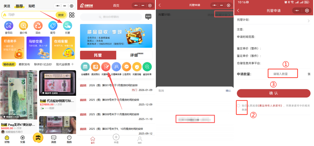 ①微信里搜索“乐易呗商城”小程序,点击进入,点击“托管”进入中藏仓储小程序;